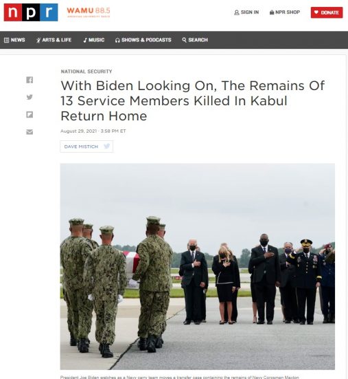 npr방송에 의하면 29일 낮 11시40분 델라웨어주 도버공군기지에 도착학 군수송기에서 아프간 전사자 시신이 안치된 관이 밖으로 나오자 조 바이든 대통령과 정부 각료들이 가슴에 손을 얹고 예의를표했다.