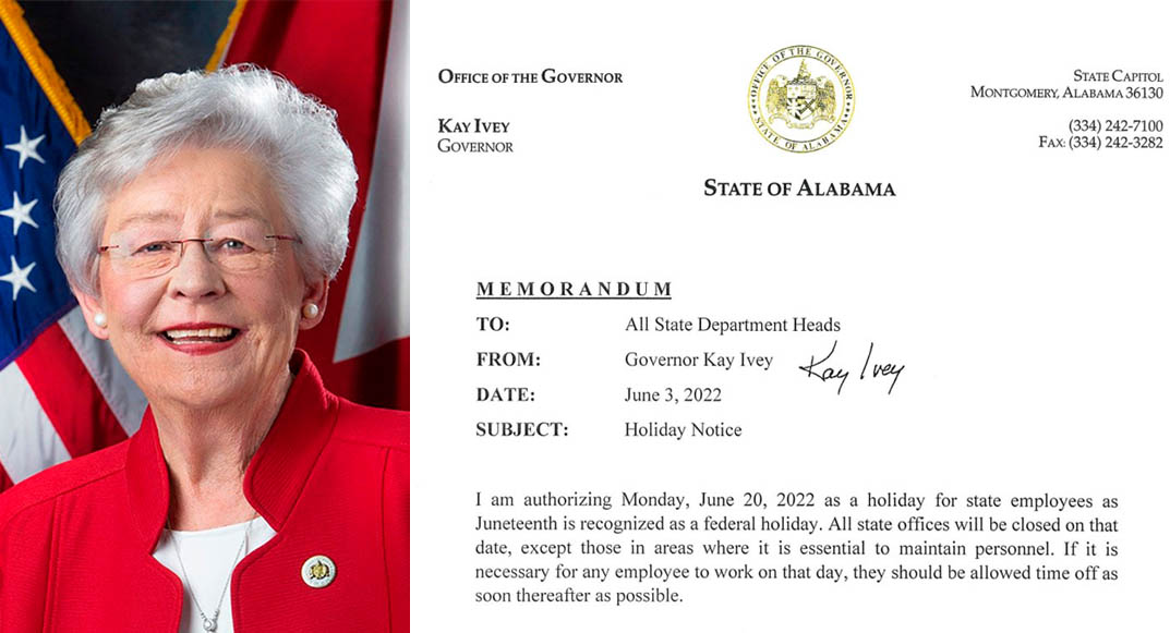 케이 아이비(Kay Ivey) 주지사는 2022년 6월 20일을 앨라배마 주의 공휴일인 6월 20일로 승인했다. 이에 따라 필수적인 지역을 제외한 모든 주정부 공공기관은 이날 문을 닫는다.