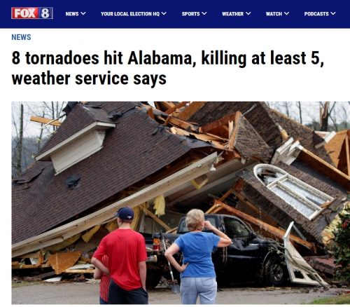 이번 악천후로 나무가 쓰러지고 가옥이 파손되면서 칼훈 카운티를 중심으로 앨라배마에서 최소 5명이 숨진 것으로 보고됐다. 또 아직 집계되지 않은 부상자도 다수 발생한 것으로 정부는 보고 있다.
