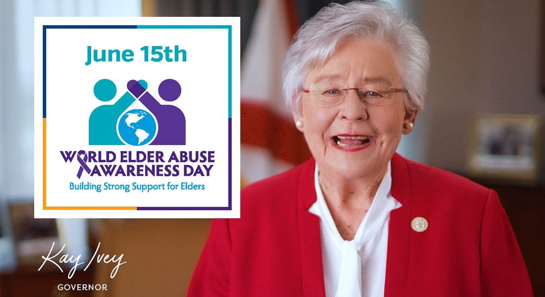 케이 아이비(Kay Ivey) 주지사는 화요일(7일) 노인 학대 문제에 대한 인식을 높이기 위해 앨라배마에서 2022년 6월 15일을 세계 노인학대 인식의 날(World Elder Abuse Awareness Day)로 선포했다.