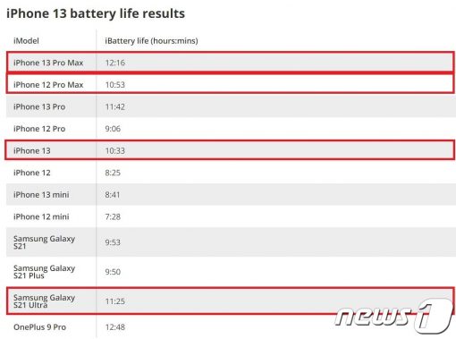 테스트 결과에 따르면 아이폰13 시리즈의 최상위 모델인 아이폰13프로 맥스모델의 사용시간은 120헤르츠(㎐) 주사율을 적용한 상태에서도 12시간16분으로 가장 길었다. 이보다 배터리 크기가 적은 아이폰13프로 역시 사용시간이 11시간42분에 달했다.