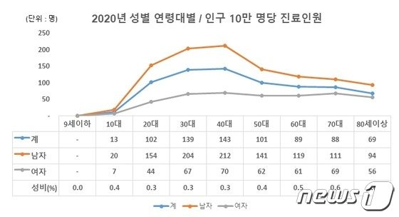 공단 진료데이터(전체 인원 4만8261명)로 연령대별 진료인원을 보면 40대가 24.7%(1만1916명)로 가장 많았고 30대가 20.5%(9884명), 50대가 18%(8685명) 순이었다. 남성의 경우 40대가 차지하는 비율이 25.9%로 가장 높았고 여성 역시 40대가 많았다.