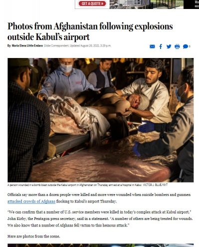 아프가니스탄 수도 카불의 공항 근처에서 자살폭탄테러가 일어나 미군을 포함해 70여명이 사망했다.
