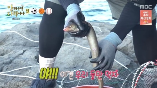 이들은 통발을 확인하러 갔다가 엄청난 사이즈의 장어를 발견하고 깜짝 놀랐다. 안정환은 현주엽을 향해 “야! 이건 우리 둘만 먹자”라고 해 웃음을 자아냈다.
