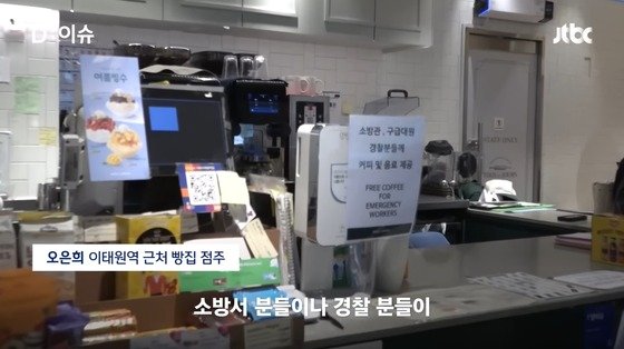 점주 오은희씨(42)는 JTBC와의 인터뷰에서 “애도하는 마음에서 문을 닫는 건 맞는데 소방관분들이나 경찰분들이 어디 들어가서 잠깐 쉴 공간이 하나도 없지 않으냐. 여기 와서 인터넷도 쓰시고 잠깐 커피라도 한 잔 드시고 가시라고 (불을 켜놨다)”고 말했다.