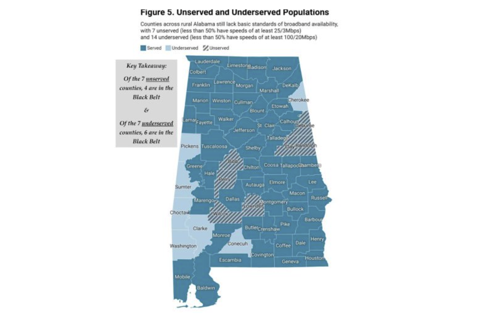 보고서에 따르면 블랙벨트 지역 전체의 초고속 인터넷 보급률은 76% 수준으로 주 평균 87%, 전국 평균 94%에 비해 크게 낮다. 지도 분석에서는 주 전체 면적의 상당 부분이 여전히 ‘서비스 미제공(unserved)’ 또는 ‘서비스 부족(underserved)’ 지역으로 나타났다.