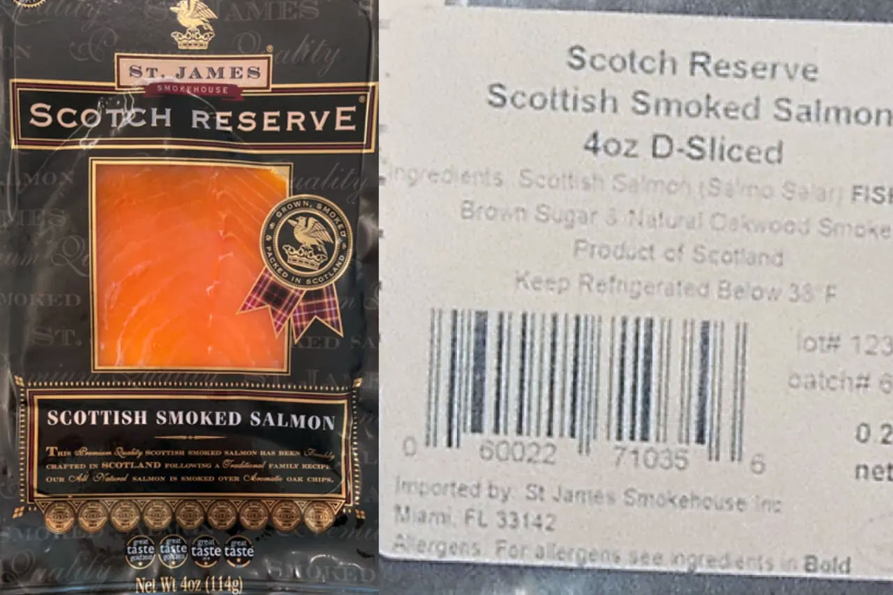 마이애미의 세인트 제임스 스모크하우스(St. James Smokehouse)는 자발적으로 자사 제품 중 세인트 제임스 스모크 하우스 브랜드, 스카치 리저브 스코틀랜드 훈제 연어(Scotch Reserve Scottish Smoked Salmon), 4온스 패키지 랏 번호 123172 및 UPC 코드 060022710356 등에 대한 총 93건을 리콜한다고 밝혔다.