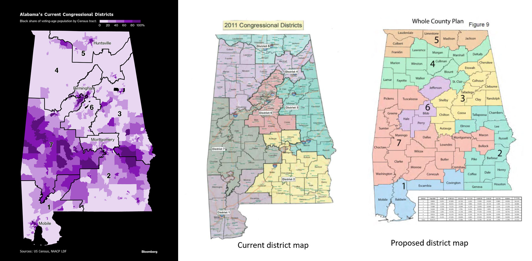 앨라배마주의 전체 인구 비율을 고려하면, 총 7명의 앨라배마 연방하원의석 중에서 흑인 인구를 대변할 수 있는 의석이 2개는 되어야 한다는 주장이다.