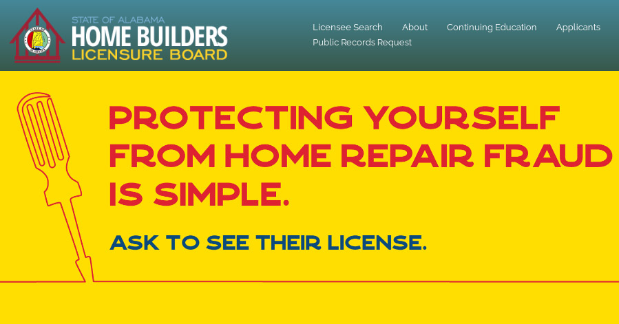 주택 건설업자 면허 위원회 웹사이트를 방문하면, 앨라배마 주에서 면허를 받은 계약업체인지 확인할 수 있다. ▲웹사이트 주소= https://hblb.alabama.gov/