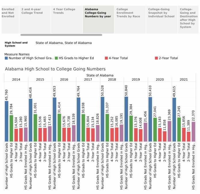 앨라배마 고등교육위원회(ACEH)의 새로운 자료에 따르면, 앨라배마의 2021년 공립 고등학교 졸업생은 2020년 졸업생보다 약간 높은 대학진학율을 보였다. 그러나 팬데믹 이전에 비하면 아직은 낮은 55% 수준에 머무르고 있다.