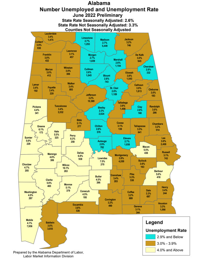 실업률은 적극적으로 일자리를 찾고 있는 앨라배마인들의 수를 측정한다. 계절적 요인을 감안한 6월 실업자 수는 6만3338명으로, 2021년 5월 6만1585명, 2021년 6월 7만9439명에 비해 사상 최대다.