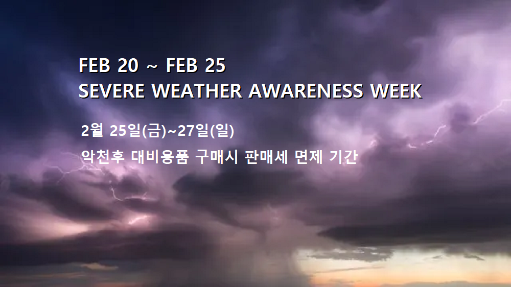 이 기간 동안 주민들은 특정 악천후 대비용품을 주 판매세 없이 구입할 수 있다. 이 목록에는 다양한 배터리, 휴대폰 충전기, 손전등, 구급상자가 포함돼 있다. 전체 목록은 아래 링크를 클릭해 확인할 수 있다.