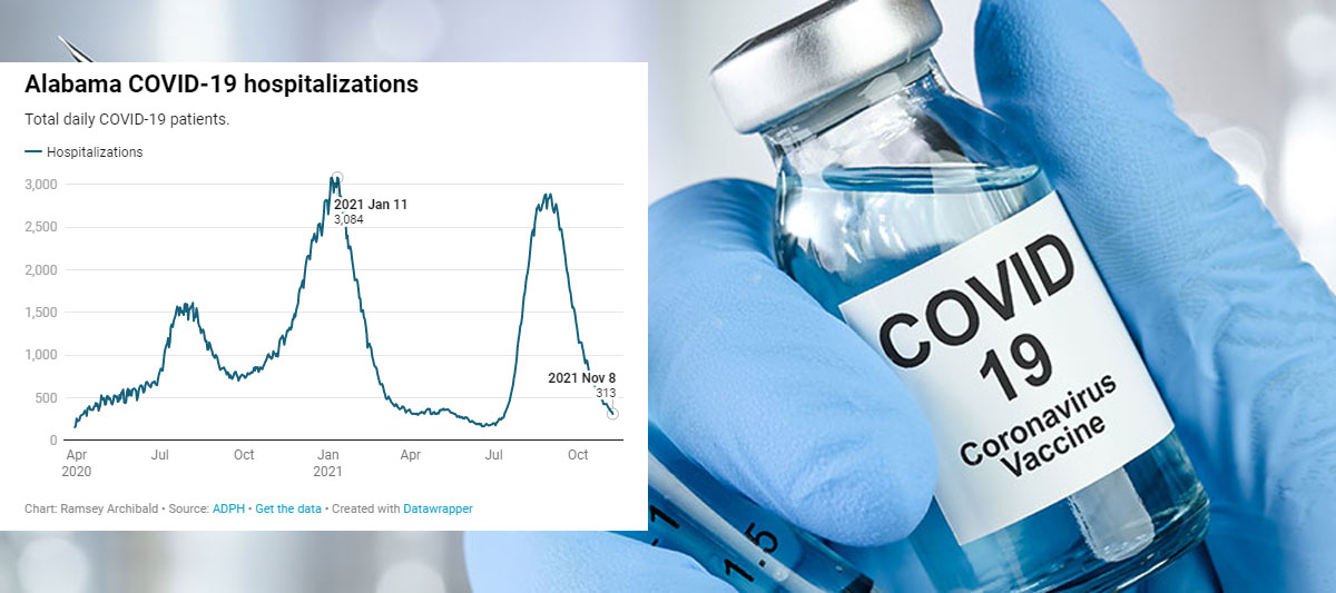 주의 사례 비율과 양성 비율이 급락하면서 앨라배마주의 COVID 입원도 11월에 급격한 감소세를 이어갔다. 앨라배마 공중보건부는 9월초에 약 2900명 가까웠던 입원환자수가 8일(월) 현재 313명으로 줄어들었다고 보고했다. 이는 7월 11일 이후 가장 낮은 수치다.