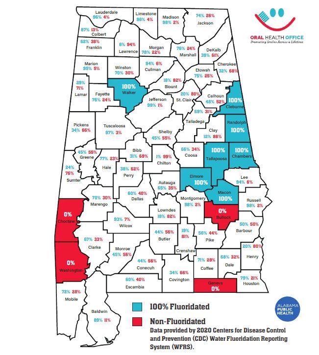 앨라배마주의 공공 수돗물 시스템에서 카운티별로 불소 첨가 여부가 다른 것으로 나타났다. 2020년 기준으로, 알라바마주 67개 카운티 중 7개 카운티는 모든 수돗물 시스템에 불소가 첨가되어 있으며, 26개 카운티는 최소 75%의 수돗물에 불소가 포함되어 있는 것으로 드러났다. 그러나 4개 카운티(Choctaw, Washington, Bullock, Geneva)는 수돗물에 불소가 전혀 포함되지 않으며, 13개 카운티는 25% 미만, 27개 카운티는 50% 미만의 수돗물에 불소가 포함된 것으로 나타났다.