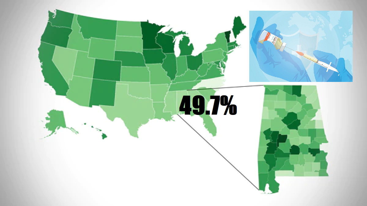 질병통제예방센터(CDC) 자료에 따르면, 2월 9일(수) 현재, 앨라배마주는 전체 주민의 49.7%만이 완전 백신접종을 한 것으로 나타났다. 전국에서 완전접종자가 50%미만인 주는 앨라배마주 한 곳 뿐이다.