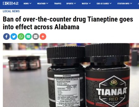 앨라배마 보건부는 티아넵틴이 마약성분을 함유한 약물로 규정하고 시중 판매를 중단하는 법을 15일부터 발효했다.