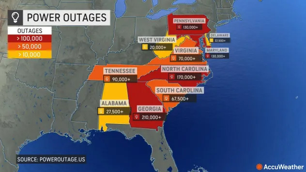 정전 피해가 가장 많은 지역은 노스캐롤라이나로 최소 22만7000여 가구가 정전을 겪고 있으며 펜실베이니아주에서는 14만9000여 가구가 단전됐다. 취소된 항공편은 1700여편, 연착된 항공편은 8000여편에 달한다.