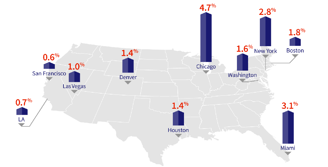 코어로직에 따르면, 전국에서 가장 높은 에쿼리 상승을 보인 10대 도시에는 시카고(4.7%), 마이애미(3.1%), 뉴욕(2.8%), 보스톤(1.8%), 워싱턴DC(1.6%), 휴스턴(1.4%), 덴버(1.4%), 라스베이거스(1.0%), 로스앤젤레스(0.7%), 샌프란시스코(0.6%) 순이다.