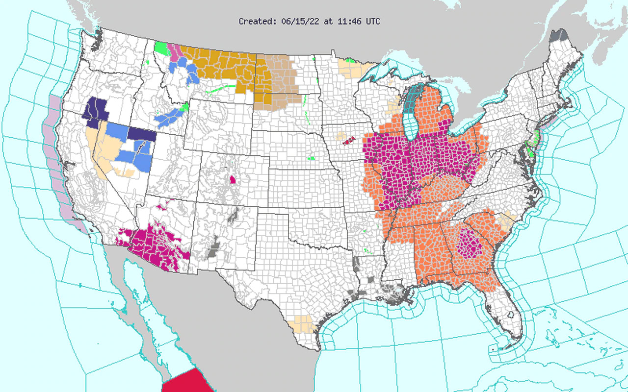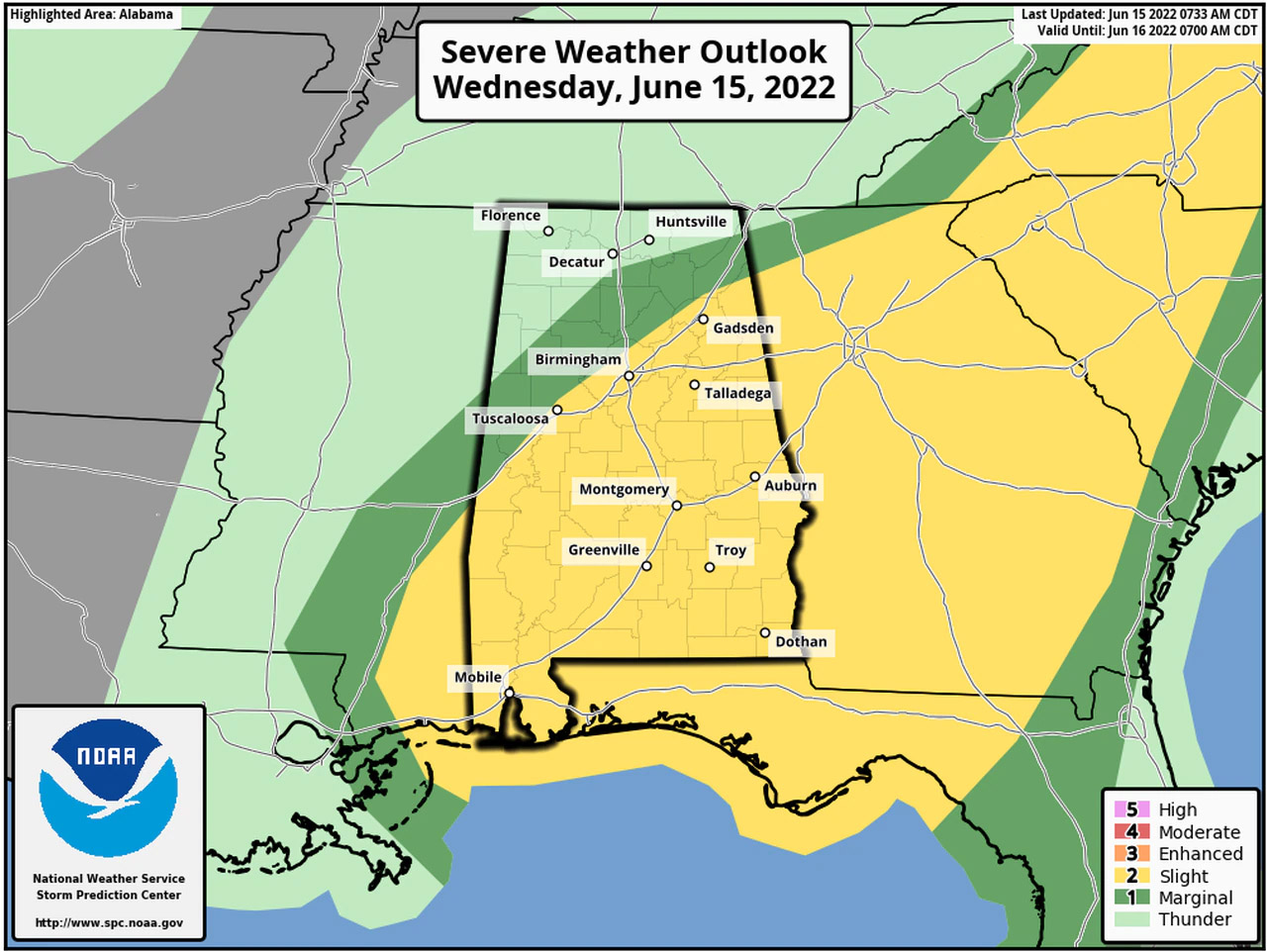 남서부 지역은 수요일 오전 11시부터 오후 7시까지 폭염주의보가 내려졌다. 해당지역은 Choctaw, Washington, Clarke, Wilcox, Monroe, Conecuh, Butler, Crenshaw, Escambia, Covington, Mobile 및 Baldwin 카운티 등이다. 열지수는 105~111 사이로 예상된다.