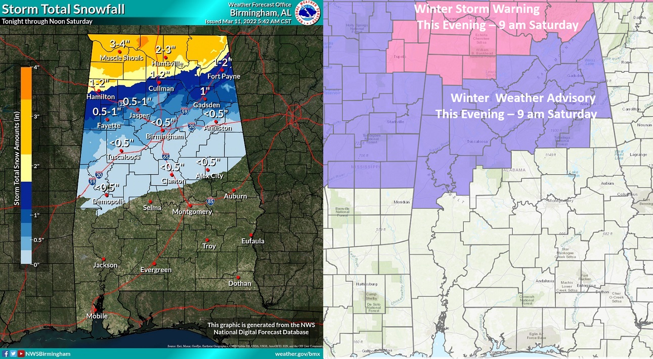 국립기상청은 앨라배마 북부 일부 지역에 토요일 아침까지 최고 4인치의 눈이 내릴 것이라고 밝혔다. 북중부 앨라배마에서는 2인치 정도의 다소 적은 눈이 예상된다.