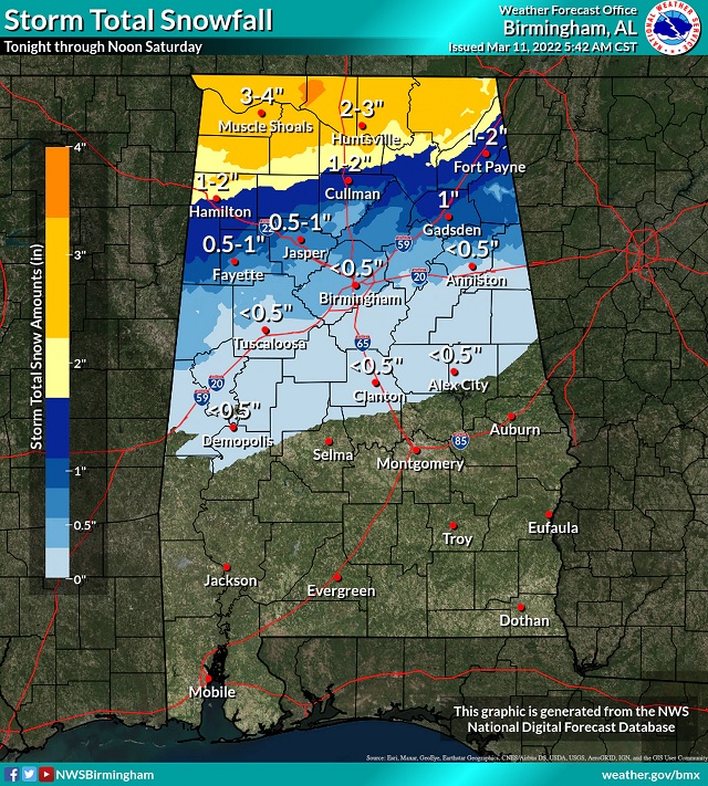 국립기상청은 앨라배마 북부 일부 지역에 토요일 아침까지 최고 4인치의 눈이 내릴 것이라고 밝혔다. 북중부 앨라배마에서는 2인치 정도의 다소 적은 눈이 예상된다.