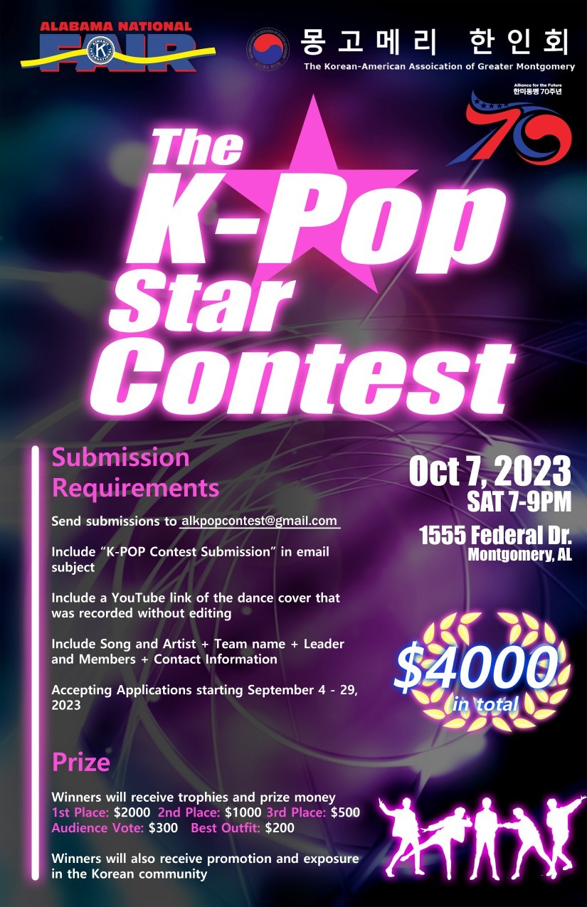 몽고메리한인회가 후원하고 앨라배마 내셔널 페어가 주관하는 “K-팝 스타 콘테스트”가 오는 주말 몽고메리에서 열린다.