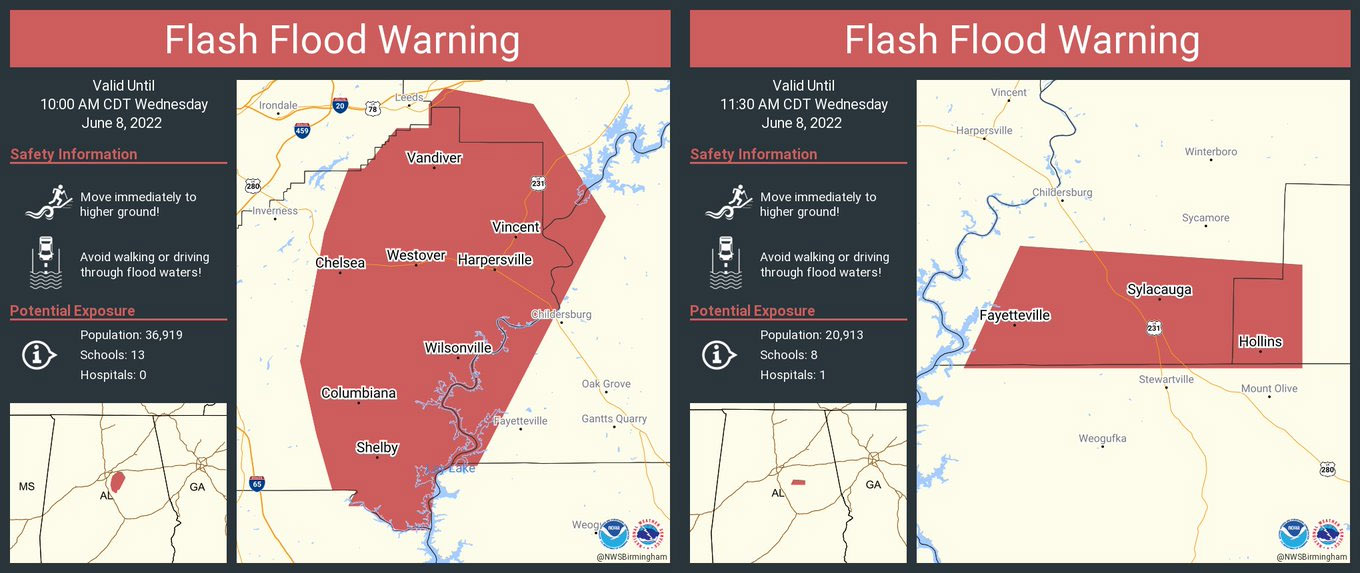 남서부 세인트클레어, 셸비 동부 및 탈라데가 남서부 카운티에서 오전 10시까지 홍수 경보가 발효 중이다. 기상청은 이 지역에 오늘까지 2에서 4인치의 비가 내렸으며 추가 1인치가 가능할 것이라고 말했다.