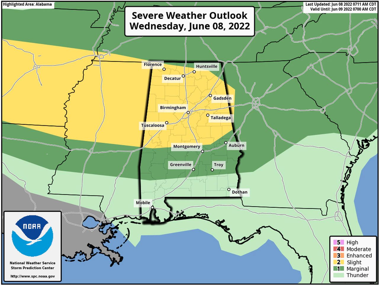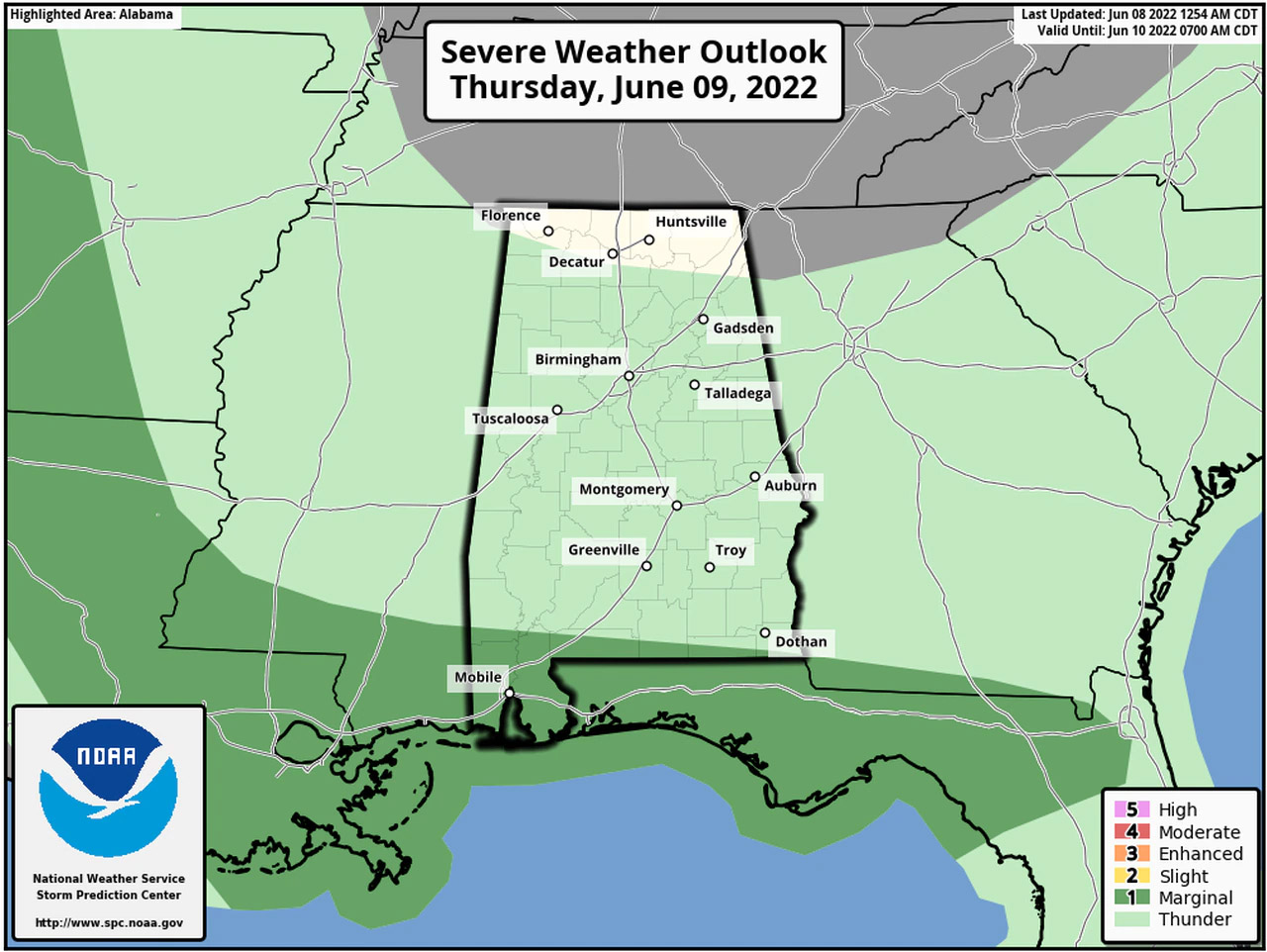 폭풍예보센터는 앨라배마주 남부 일부 지역에 1단계(또는 한계)의 악천후 위험을 추가했다.