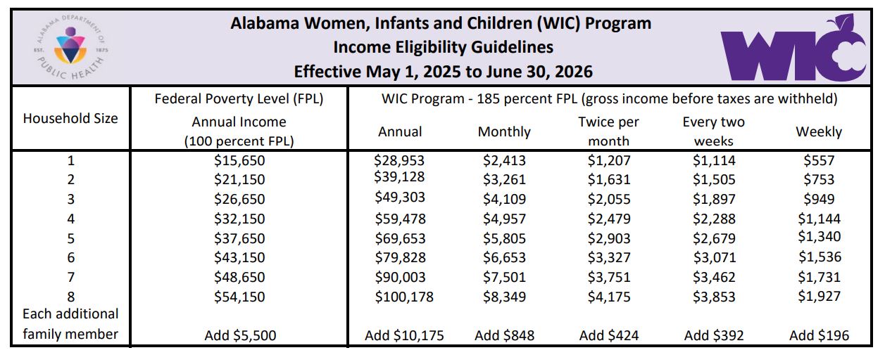 앨라배마주에서는 연방 빈곤선의 185%에 해당하는 소득을 기준으로 WIC 자격을 결정했다. 예를들어 2인 가구의 경우 연간 소득이 약 $37,814 이하일 때 자격이 주어지며 3인 가구는 연간 $47,767 이하, 4인 가구는 $57,720 이하일 경우 자격이 주어진다.