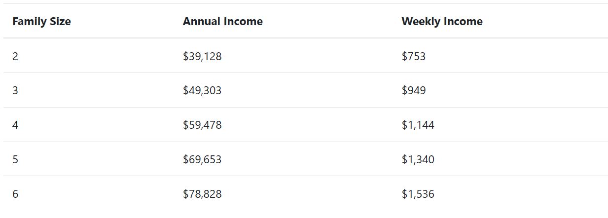 앨라배마주에서는 연방 빈곤선의 185%에 해당하는 소득을 기준으로 WIC 자격을 결정했다. 예를들어 2인 가구의 경우 연간 소득이 약 $37,814 이하일 때 자격이 주어지며 3인 가구는 연간 $47,767 이하, 4인 가구는 $57,720 이하일 경우 자격이 주어진다.