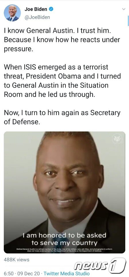 | 조 바이든 대통령 당선인이 8일(현지시간) 트위터에 시사잡지 애틀랜틱 기고문 ‘내가 국방장관에 로이드 오스틴을 선택한 이유’ 링크와 함께 국방장관 발탁 배경을 밝혔다. © 뉴스1 |