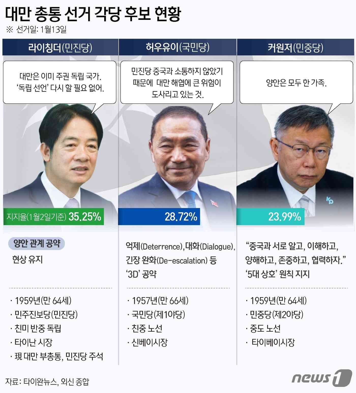대만 현지 매체를 종합하면 집권 민진당의 라이칭더 총통 후보와 제1야당 국민당 허우유이, 제2야당 커원저 후보가 선거 막판까지 양안(중국-대만) 공약을 내세워 표심잡기에 총력전을 펼쳤다.