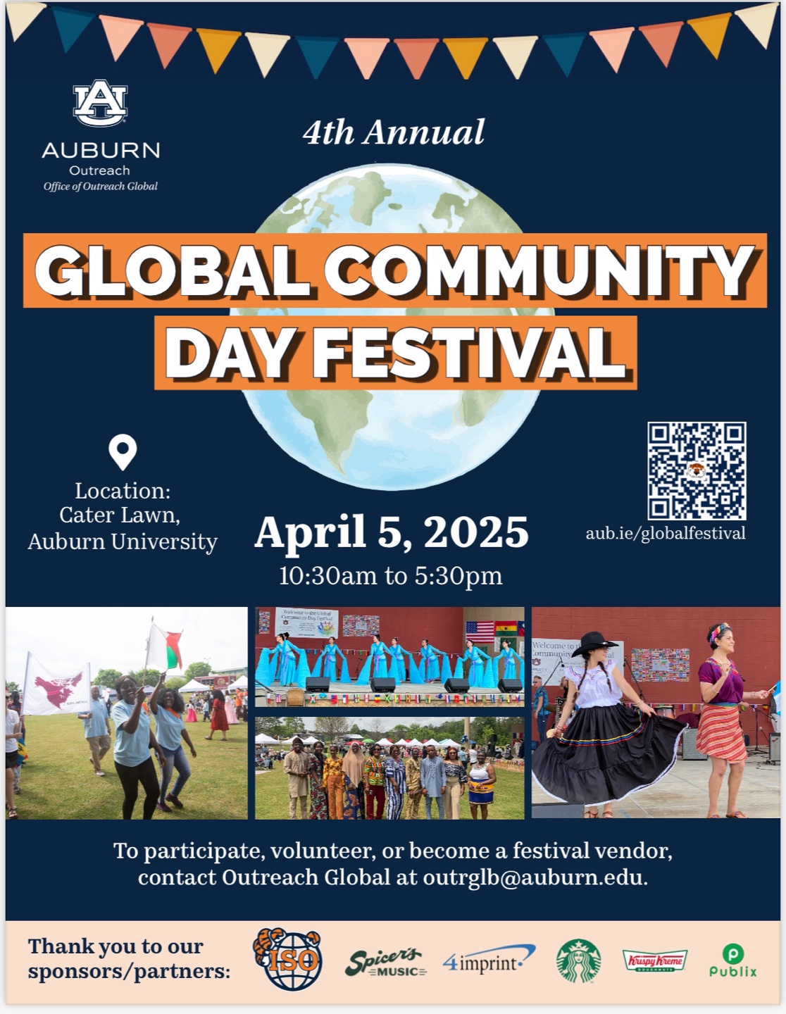 어번대학교 아웃리치 이 주최하는 ‘글로벌 커뮤니티 데이 페스티벌이’이 4월 5일 오전 10시 30분부터 오후 5시 30분까지 어번대학교 카터(Cater Lawn, Auburn University, AL 36849) 에서 열린다.