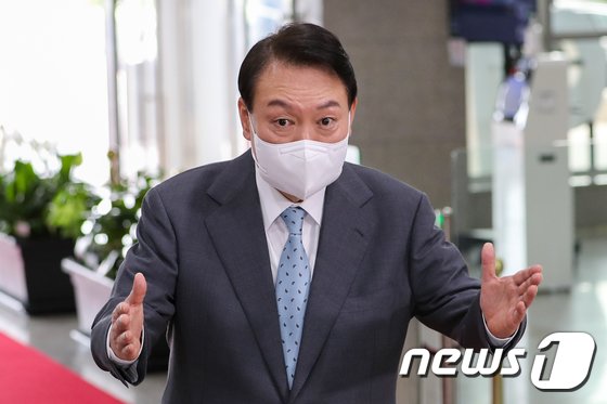 윤석열 대통령이 20일 오전 용산 대통령실에서 열린 출근길 약식 기자회견(도어스테핑)에서 취재진 질문에 답하고 있다. 대통령실사진기자단 2022.7.20/뉴스1 © News1 안은나 기자