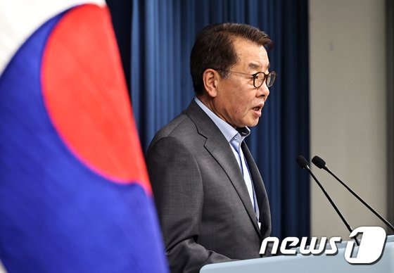 최영범 홍보수석이 17일 용산 대통령실 브리핑룸에서 탈북어민 강제북송 사건에 대한 대통령실 입장을 밝히고 있다. (대통령실사진기자단) 2022.7.17/뉴스1 © News1 안은나 기자