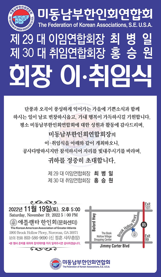 미동남부한인회연합회는 오는 19일(토) 오후 5시, 애틀랜타한인회 문화센터에서 최병일 제29대 연합회장과 홍승원 제30대 연합회장의 이·취임식을 개최한다.