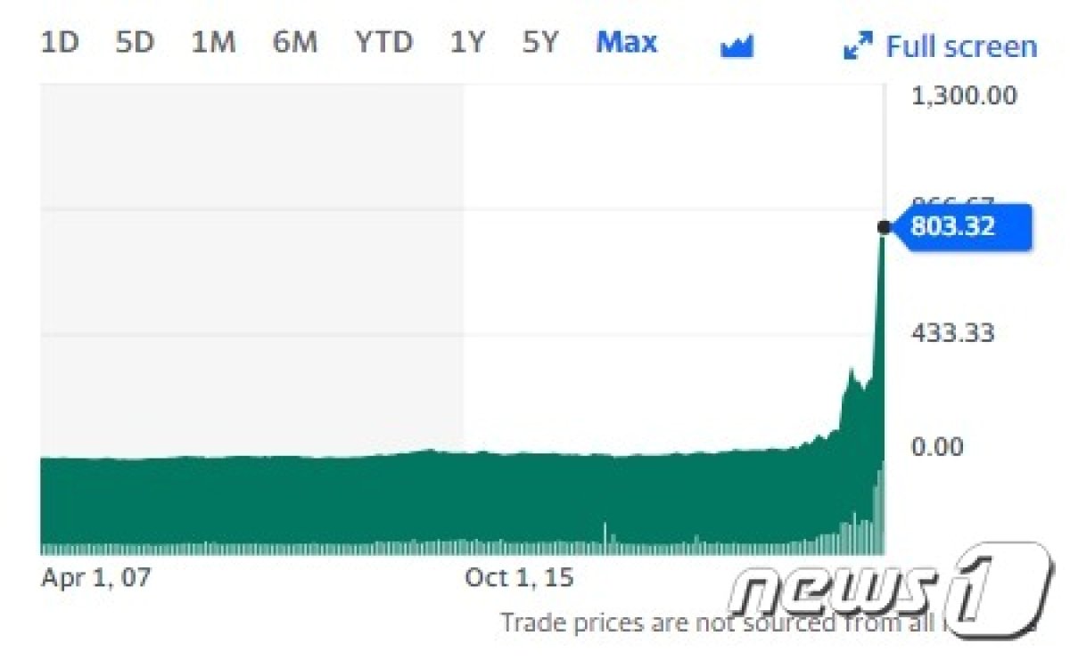 그런데 이를 압도하는 기업이 있다. 바로 ‘슈퍼 마이크로 컴퓨터’다. 이 회사는 지난 주말 20% 폭락했음에도 한 달간 176% 폭등하는 등 지난 1년간 무려 841% 폭등했다.
