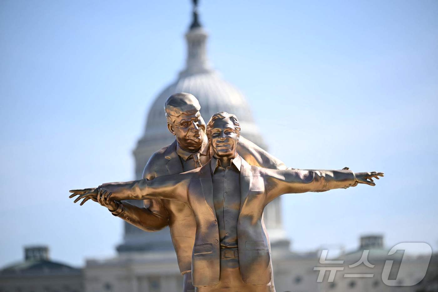 워싱턴포스트(WP)에 따르면 익명의 예술가가 9일(현지시간) 워싱턴DC 국회의사당 앞 내셔널몰에 해당 조각상을 설치했다. 작품은 트럼프 대통령이 영화 ‘타이타닉’의 유명 장면처럼 엡스타인을 뒤에서 끌어안은 모습을 형상화한 것으로, 높이는 약 3.6m에 달한다.