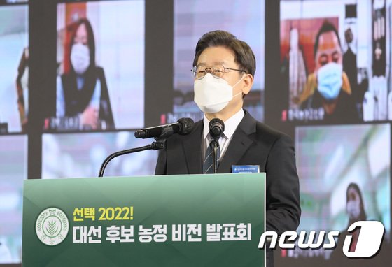 이재명 더불어민주당 대선 후보가 4일 오후 서울 송파구 잠실학생체육관에서 열린 대선후보 농정 비전발표회에서 농정비전을 발표하고 있다. 2022.2.4/뉴스1 © News1 국회사진취재단