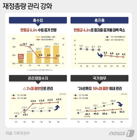 앞서 정부는 국가재정운용계획에서 2026년까지 국가 재정 지출(총지출) 증가율을 연 평균 4.6% 수준으로 관리하겠다고 밝혔다. 내년 총지출 증가율은 5.2%로 설정했지만 내후년부터는 4.8%, 4.4%, 4.2% 등으로 차츰 축소할 계획이다.