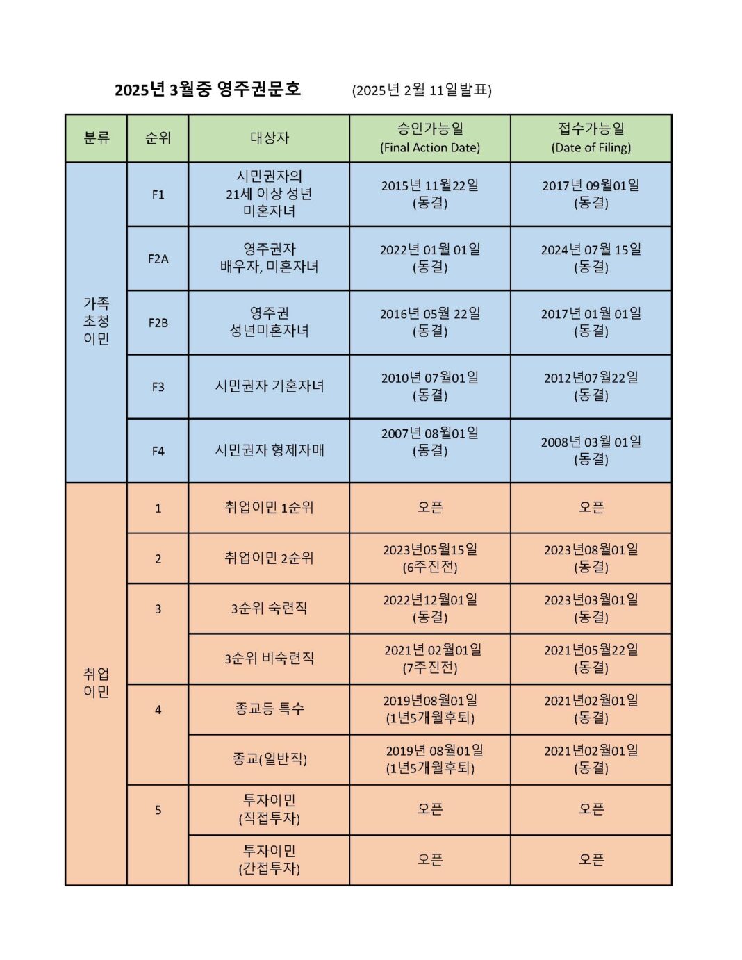연방 국무부가 12일 ‘2025년 3월 영주권 문호’를 발표했다.