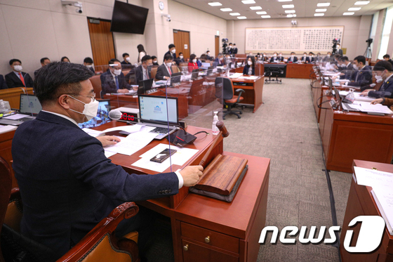 윤호중 법사위원장이 17일 오전 서울 여의도 국회에서 열린 법제사법위원회 전체회의에서 의사봉을 두드리고 있다. 2021.2.17/뉴스1 © News1 성동훈 기자