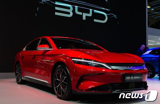 ‘2022 파리국제모터쇼(MONDIAL DE L’AUTO PARIS)’ 프레스데이에서 중국 자동차 브랜드 비야디(BYD)가 자사 플래그쉽 모델 ‘한(HAN)’을 선보이고 있다. 2022.10.18/뉴스1. © News1 이준성 기자
