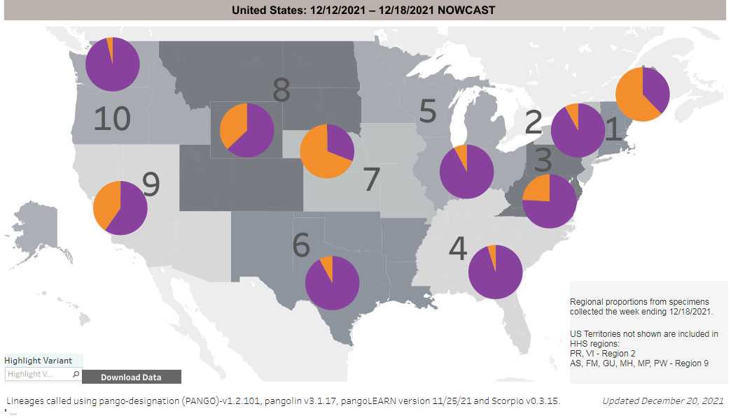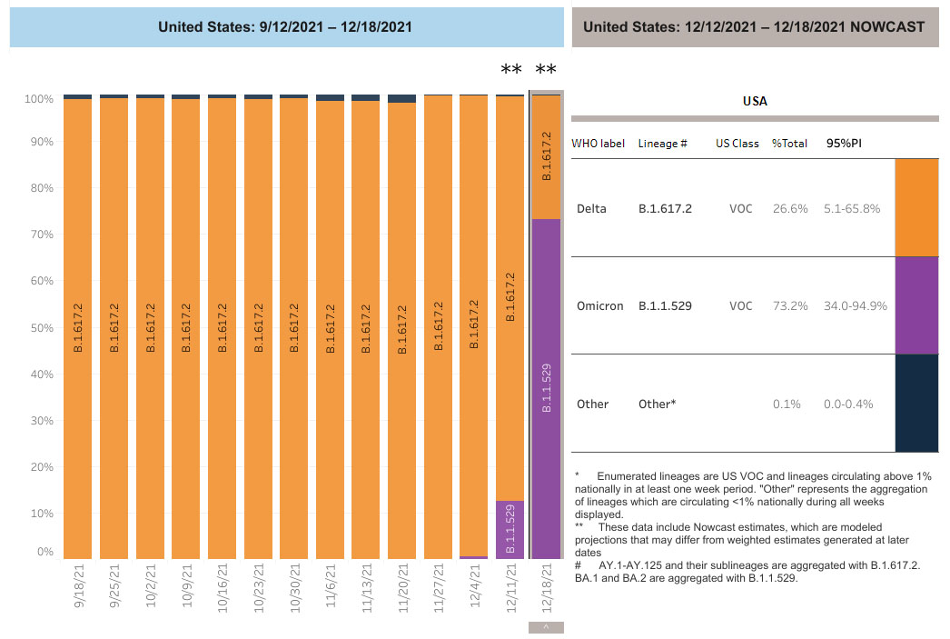 20일(월) 최종 업데이트된 데이터에 따르면, 12월 18일 주말까지 오미크론이 전체 신규 사례의 73.2%를 차지한 반면, 델타 변종은 26.6%만 차지한 것으로 나타났다.