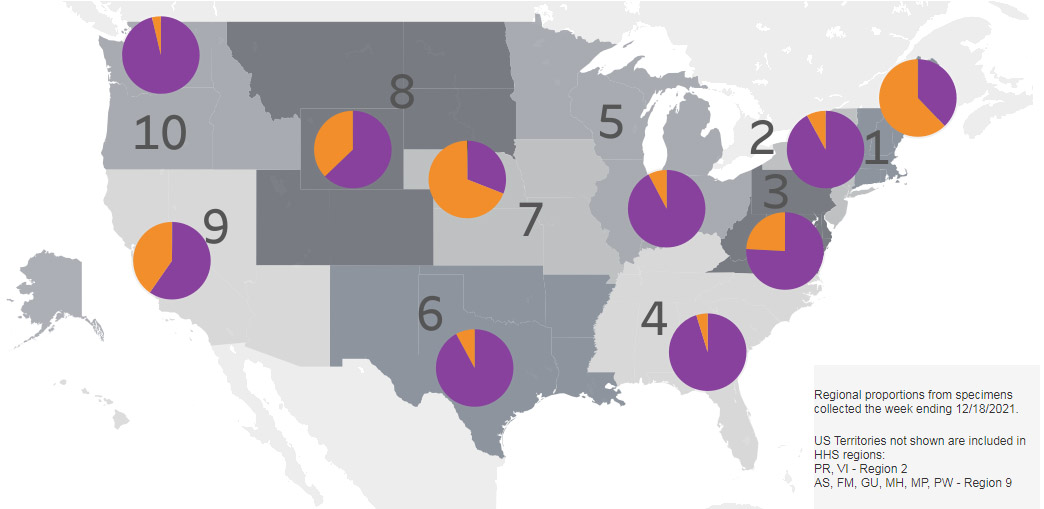 오미크론은 거의 모든 주에서 보고됐는데, 뉴욕, 남동부, 태평양 북서부 등 일부 지역에서 신규 감염 사례의 약 90%를 차지한다.