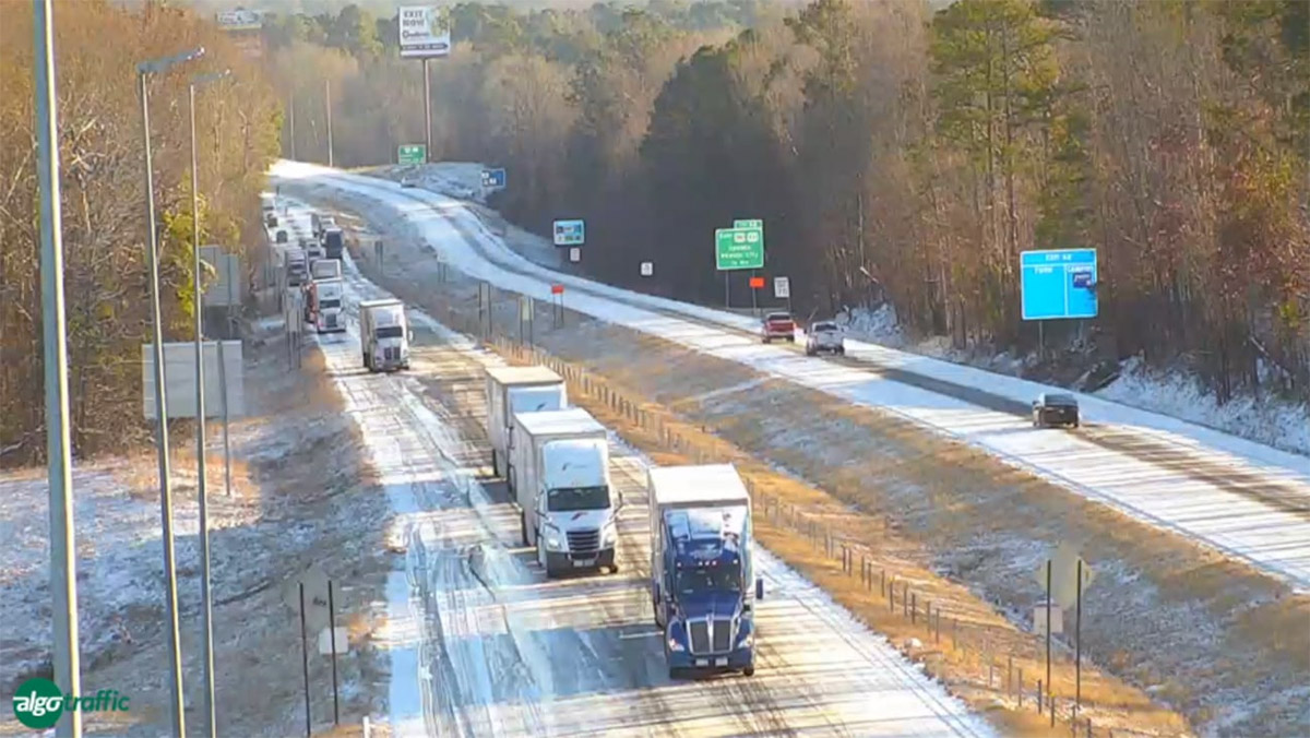 화요일 저녁 오펠라이카 60번 출구 근처에서 남쪽 방향으로 교통 흐름이 정체됐는데, 얼음이 문제였다. 앨라배마주 교통부 카메라는 I-85 고속도로의 고가 구간을 통과할 수 없는 18륜 트레일러들의 집단을 포착했다.