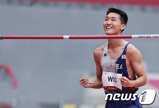 육상 대표팀 우상혁이 30일 오전 일본 도쿄 신주쿠 올림픽스타디움에서 열린 ‘2020 도쿄올림픽’ 남자 높이뛰기 예선전에서 2.17m를 성공한 후 기뻐하고 있다. 우상혁은 이날 한국 육상 25년만에 결선에 진출하는 쾌거를 기록했다. 2021.7.30/뉴스1 © News1 이재명 기자 |