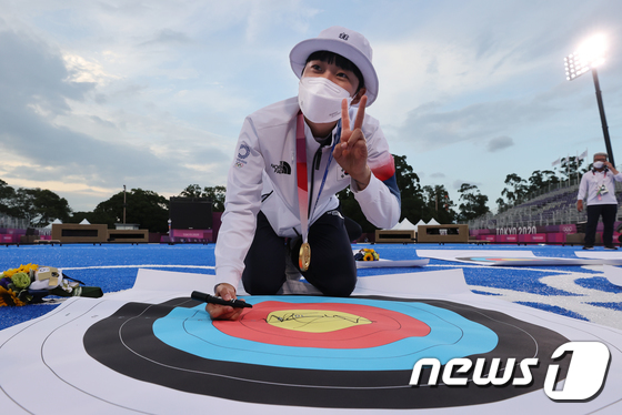 양궁 안산이 30일 일본 도쿄 유메노시마 공원 양궁장에서 열린 ‘2020 도쿄올림픽’ 여자 개인전 시상식을 마치고 과녁판에 사인을 하고 있다. 2021.7.30/뉴스1 © News1 송원영 기자 |