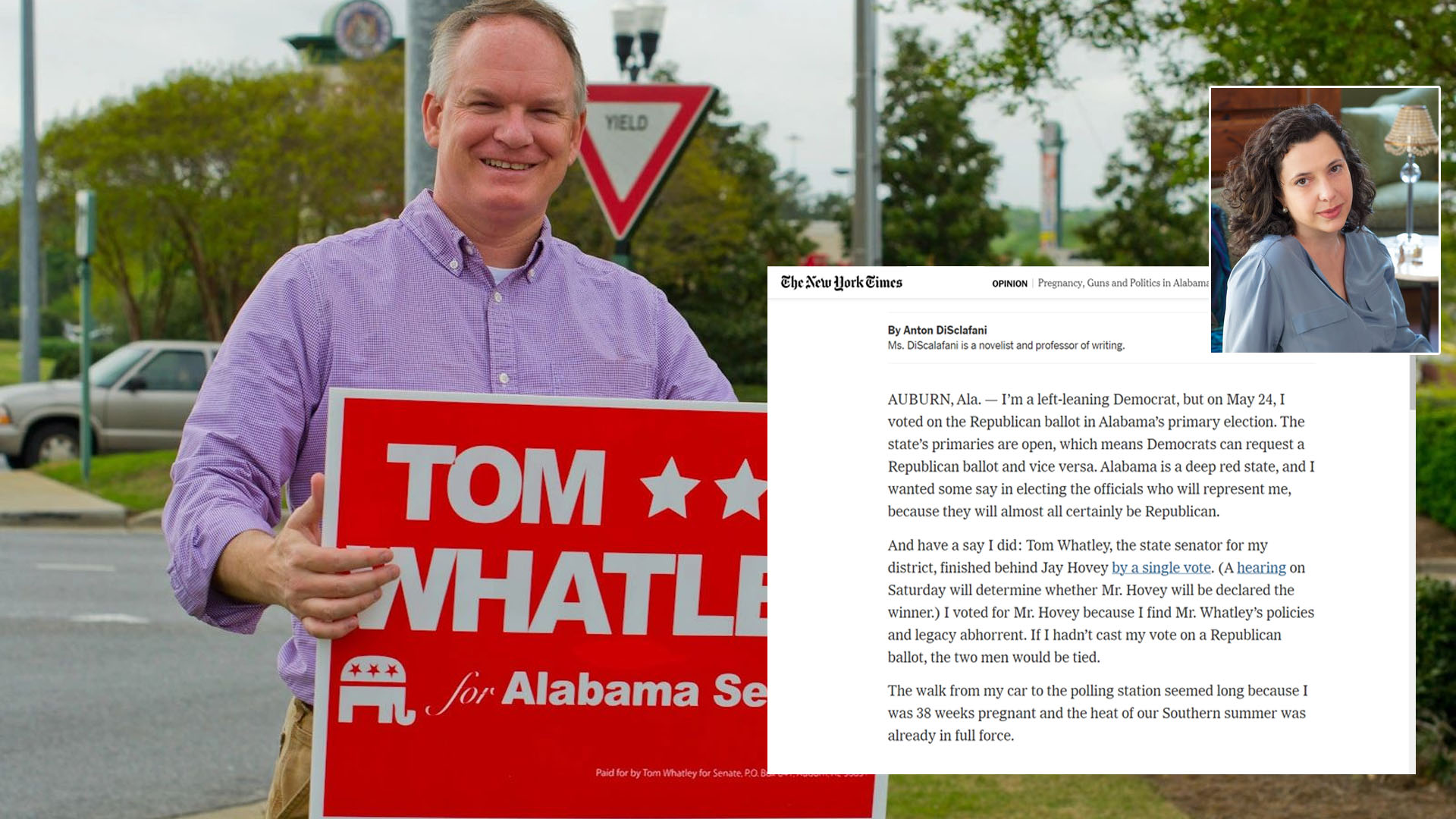 뉴욕타임스는 이번 주 월요일(20일) 소설가이자 어번대 문예창작과 교수 안톤 디스클라파니(Anton DiSclafani)의 오피니언 기고문을 실었는데, 그녀는 지난달 오번 시의원 제이 호비(Jay Hovey)와의 상원 27선거구 경선 경선에서 톰 왓틀리(Tom Whatley,공화·어번) 현직 주상원의원이 1표 차로 패배한 공로를 주장했다.