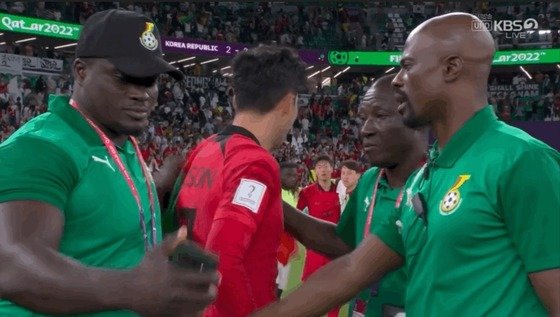 경기 후 소셜미디어를 뜨겁게 달군 건 가나 축구대표팀 관계자의 무례한 행동이었다. 검은 모자를 착용한 문제의 관계자는 눈물을 흘리는 손흥민 곁으로 다가갔다.